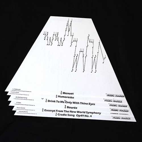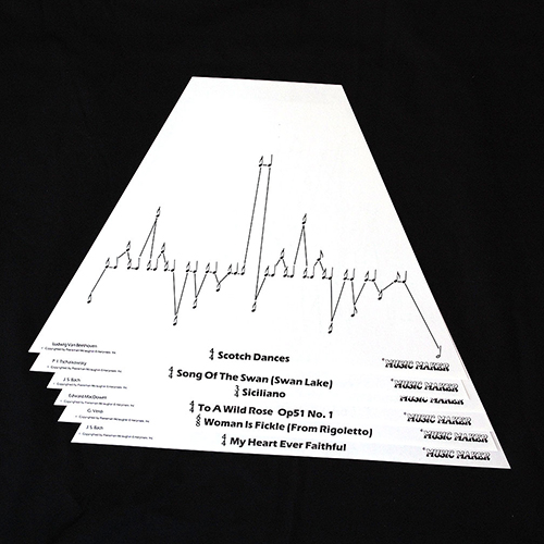 For obvious reasons, this packet of music does not include lyrics. The twelve selections included are: 1. Song of the Swan (from Swan Lake), by P.I. Tschaikowsky. 2. My Heart Ever Faithful, by Johan Sebastian Bach. 3. Siciliano, by Johan Sebastian Bach. 4. Woman is Fickle (from Rigoletto), by Guiseppi Verdi. 5. Humoreske, by Antonin Dvorak. 6. Drink to Me Only With Thine Eyes, an Old English song. 7. Scotch Dances, by Ludwig Von Beethoven. 8. To A Wild Rose, Opus 51, Number 1., by Edward MacDowell. 9. Cradle Song, Opus 49, Number 4., by Johannes Brahms. 10. Menuet, by I.J. Paderewski. 11. Excerpt From the New World Symphony, by Antonin Dvorak. 12. Bouree, by Johan Sebastian Bach. Price: $6.50 (with free shipping) |