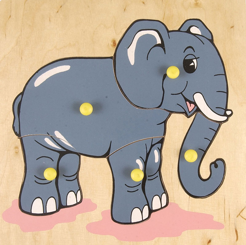 A smiling elephant children will instantly love. Five part peg puzzle. 5" wide and 9 3/4" tall. Only high quality, colorful and totally safe paints used.