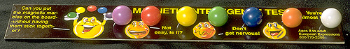 Are you smarter than a magnetic marble? Don't be so sure because placing the seven magnetic marbles on the board without having them snap together might not be as easy as you might think! The first two marbles are easy, but then the brightly colored globes begin interacting with each other...and what happens next is pure magnetic fun. The Magnetic Intelligence Test contains seven magnetic marbles and a colorful playing board. Package size; 7" x 12 3/4". Price: $7.50—and ships FREE! |