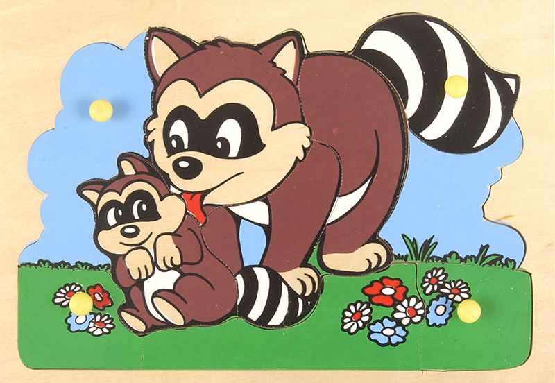 A four part peg puzzle featuring a loving racoon mother and her cub. 5" wide and 9 3/4" tall. Only high quality, colorful and totally safe paints used.