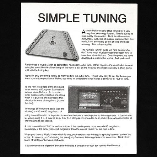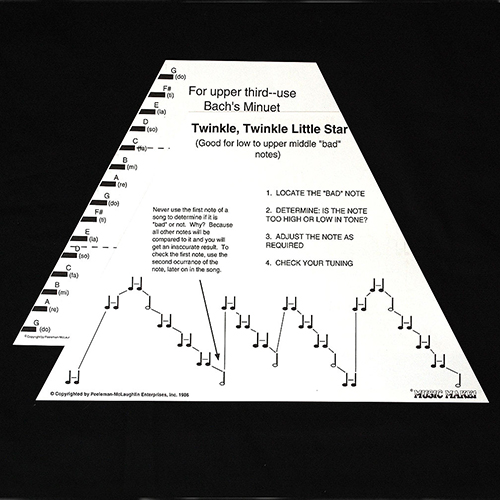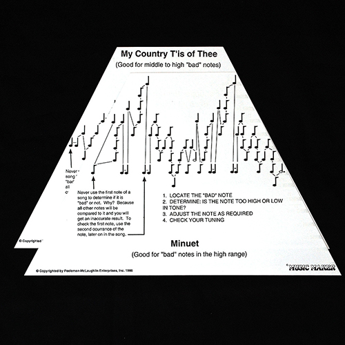 The "Tuning Made Simple" songsheet packet has been made to help people who aren't musical learn how to make simple tuning adjustments to their Music Makers. Over the years we have developed a system which allows us to identify a wire which is out of tune and make rapid and effective tuning adjustments. It's simple, it's quick, and it works. Includes a four page instructional booklet and three special songsheets to help identify the errant note(s). The instructional booklet teaches non-musical people what makes a note "out of tune", how to identify the note, and how to bring it back into tune. Price: $6.50 (with free shipping) |
