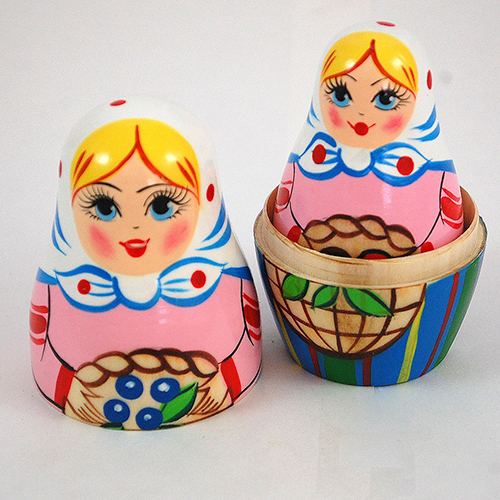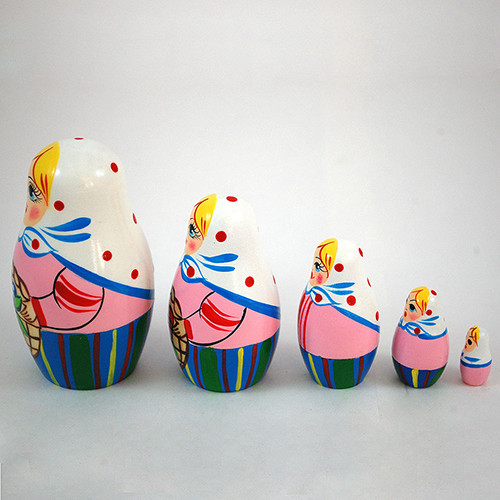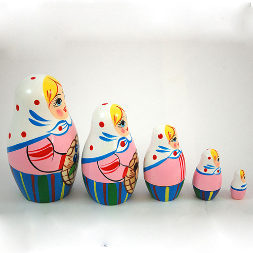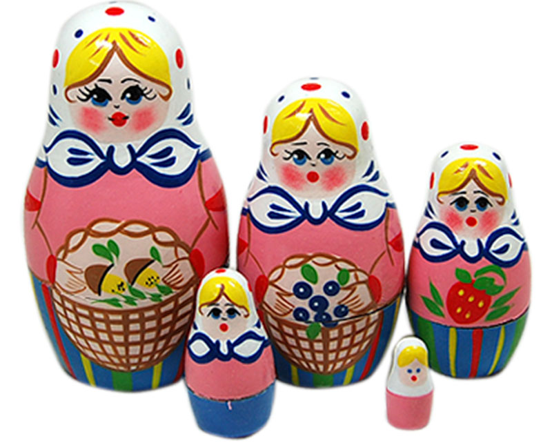 Five young girls have left their homes and entered Belarus' deep woods, woven baskets in hand, searching for billberries (resembling our blueberries) and mushrooms. The pink color makes it a favorite of girls. Five part Russian nesting doll. Three and a half inches tall. Handpainted and handlathed.
