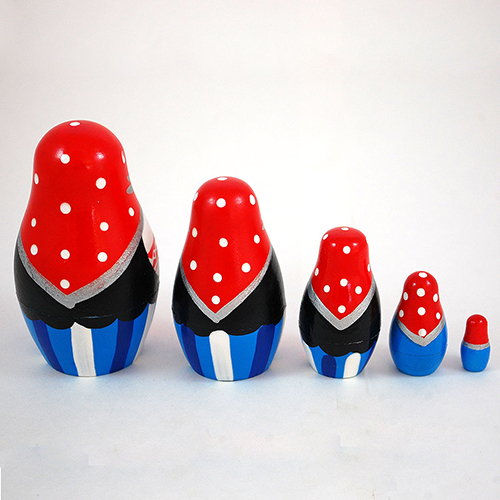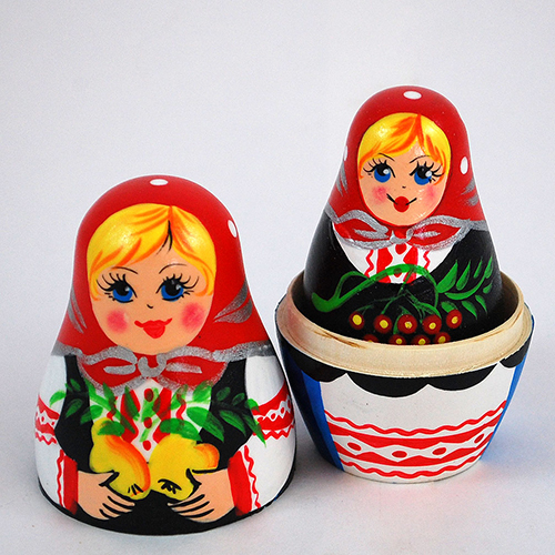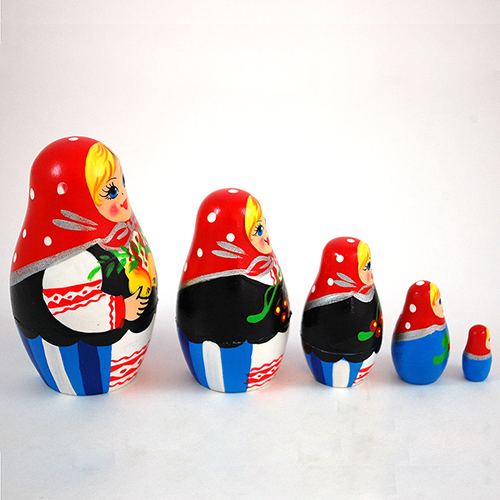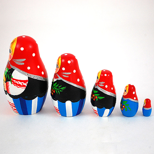 One of our most popular nesting doll sets features five village girls who hold the bounties of the year's harvest in their arms: pears, squash, gourds, and sprigs of wood berries, which we call currants. Five part Russian nesting doll, shown in bright and bold colors. Handpainted and handlathed. Three and a half inches tall. Below Amazon pricing: $21.00—and ships FREE! Please note: These are not cheap Chinese copies: poorly painted and made of uncured wood (which quickly warps or splits). In every way, these are authentic Russian nesting dolls. They are also shipped within 24 hours from our warehouse in the USA...not weeks later from Belarus or Russia. |