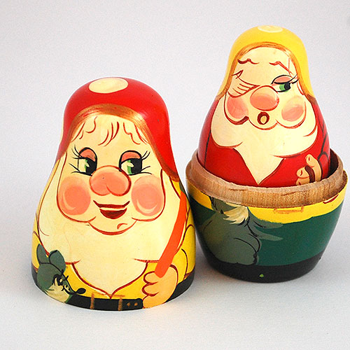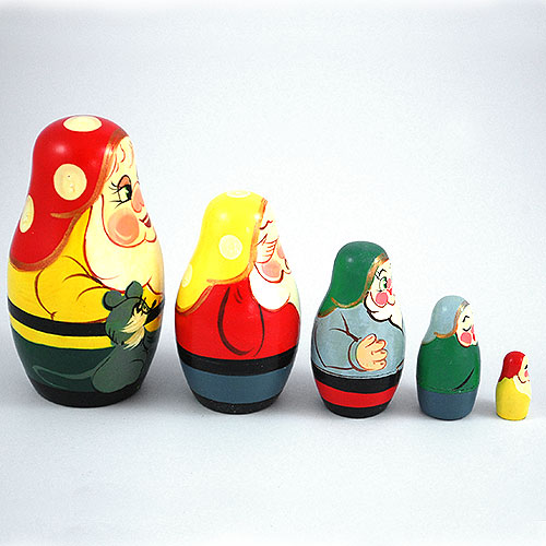 Five cheerful forest dwarves (including a sleepy one) are presented in this charming Russian nesting doll set.The largest dwarf, obviously a lover of tales, holds a book under his arm that a mouse finds most interesting, The second doll holds a lantern against the night as he fights oncoming sleepiness. The third doll holds a curved horn (to wake his sleepy friend with?). The fourth is fully asleep, and fifth dwarves finish off this jolly collection. Three and a half inches tall. Handpainted and handlathed.