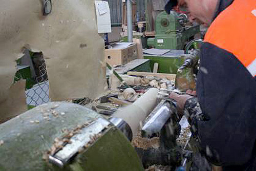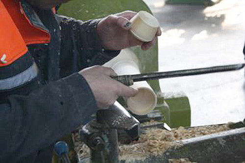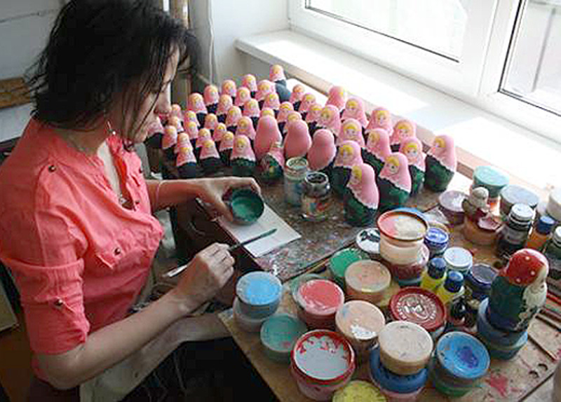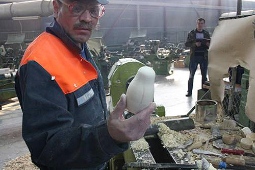 It takes a tremendous amount of skill and patience to make a Russian nesting doll. Contrary to popular belief, the dolls is made from two separate pieces of wood--not a single piece which is cut in half and then hollowed out. As you might imagine, lathing two separate pieces of wood so they fit perfectly inside each other is no easy task. The men who perform this task are truly specialists, and young men apprentice for many years before they are entrusted with producing doll "blanks." |