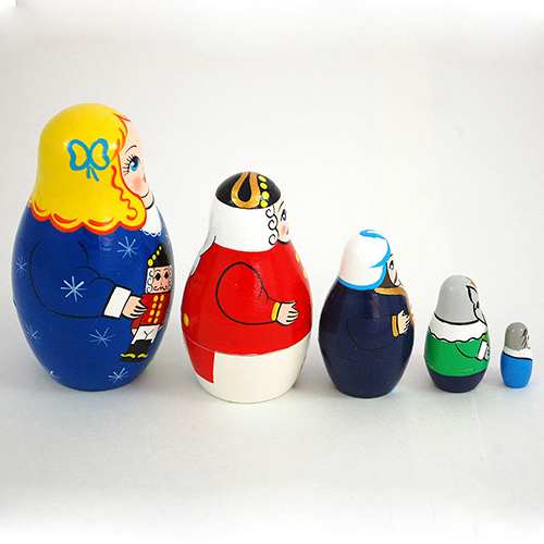 Beautiful Clara holds the nutcracker she has found beneath the Christmas tree (also shown). The next largest doll is the Nutcracker himself, then that of Clara's mysterious uncle. The mischievous Mouse King is portrayed next, and the smallest doll represents Clara's troublesome brother. Five part Russian nesting doll set inspired by Tchaikovsky's ballet "The Nutcracker," which is a holiday favorite. Three and a half inches tall. Handpainted and handlathed. Click photo for larger image.
