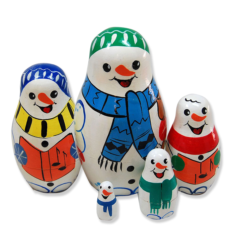 Offering a warm, holiday spirit, five cheerful--and colorfully painted--snowmen sing Christmas carols. Carrots for noses, pieces of coal for buttons, and shawls and caps (to keep them warm, of course). Three and a half inches tall. Handlathed and handpainted Russian nesting doll set. Click photo for larger image.