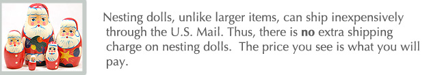 Please note: These are not cheap Chinese copies of traditional Russian matryoshkas: poorly painted and made of uncured wood (which quickly warps or splits). In every way, these are authentic Russian nesting dolls. |
