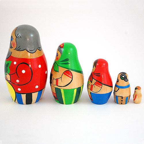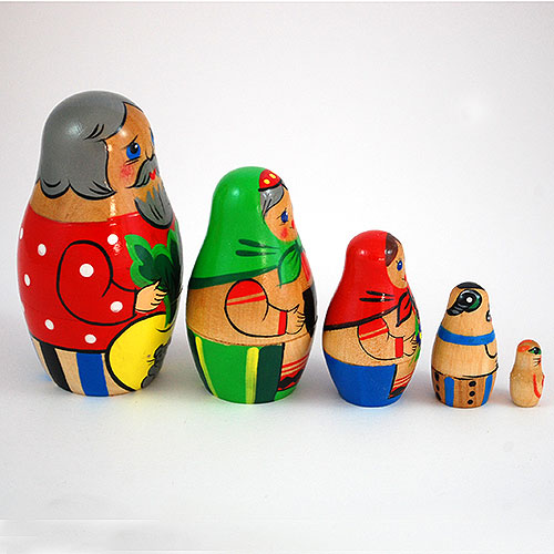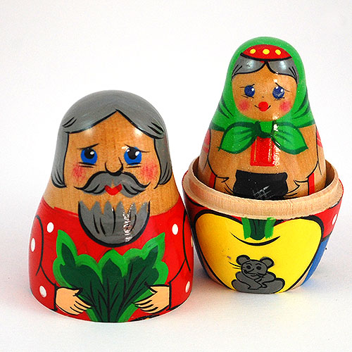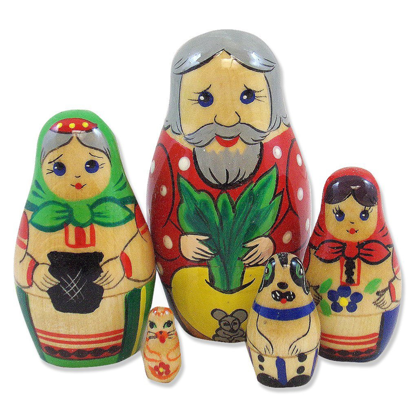A traditional Russian folk tale of cooperation, and a favorite story-telling motif in children's books. A farmer wants to pull a turnip out of his frozen garden so he can make soup. Try as he might, he can't do so. He calls his wife for help and they pull together, but also fail. In turn, the daughter, dog and the cat are called in to help. None of their efforts succeed until the mouse (charmingly shown on the largest doll) pitches in. Handpainted and handlathed Russian nesting doll set. Three and a half inches tall.