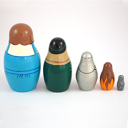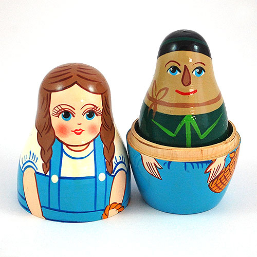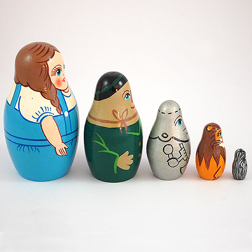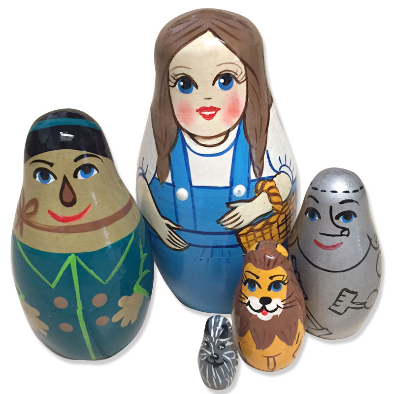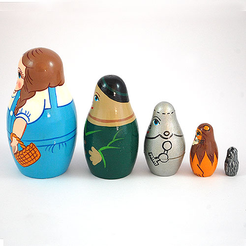 Dorothy, the young and sweet-tempered girl living with her aunt and uncle on a Kansas farm i ons the largest doll of this nesting doll set. She is portrayed in her trademark blue and white dress and holds a basket. Next come the characters who accompany Dorothy on her quest to meet the Wizard of Oz: the Scarecrow, the Tin Man, the Cowardly Lion...and last of all, plucky Toto. Three and a half inches tall. Hand painted and hand lathed.
